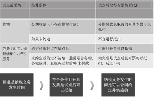 所以,由于滞后结算或刻意安排,原来对应营业税应税事项的采购,出现了滞后而得到抵扣试点后增值税销项(小规模纳税人没有此因素),小编认为这是不合规的,税务机关可以不予认可抵扣。 当然这里面如果人家销售方设置了分期收款,从纳税义务来看,这种情形是有解释空间的。